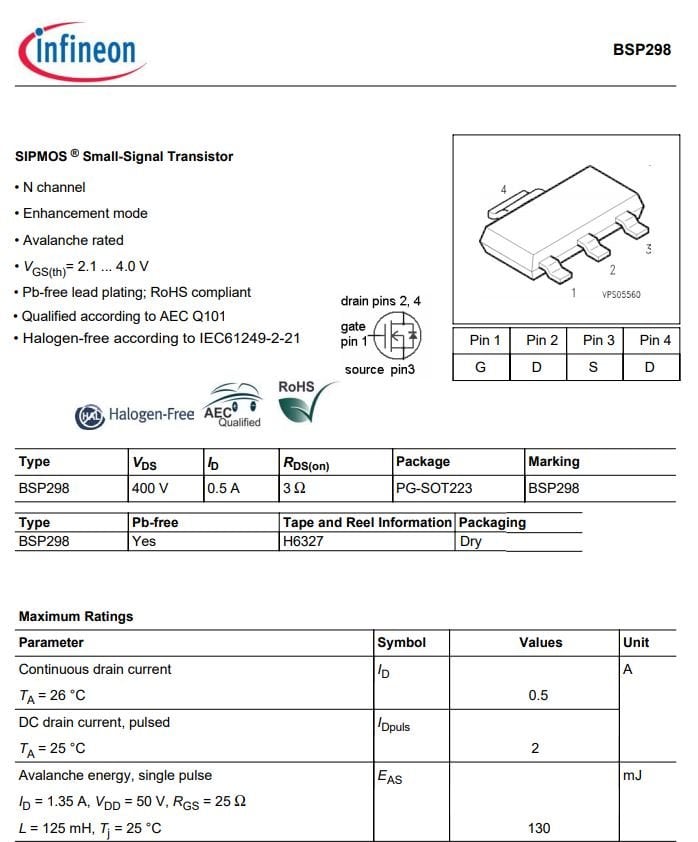 BSP298 - 400V . 500MA . PG-SOT223 - Small-Signal Transistor