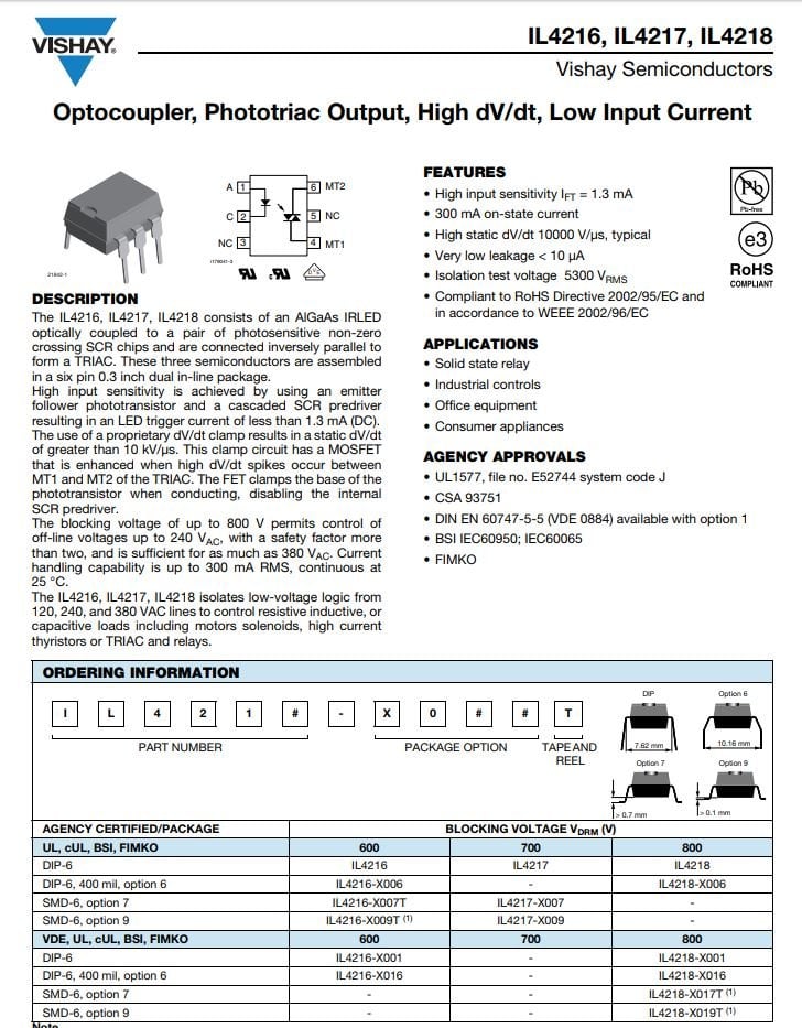 IL4218 - Optocoupler, Phototriac Output, High dV/dt, Low Input Current