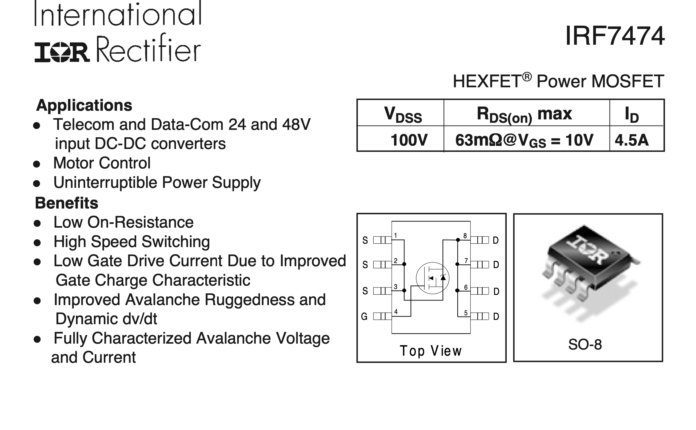 IRF7474 SO-8 , IRF7474TRPBF , 100V 63mΩ@V GS = 10V 4.5A
