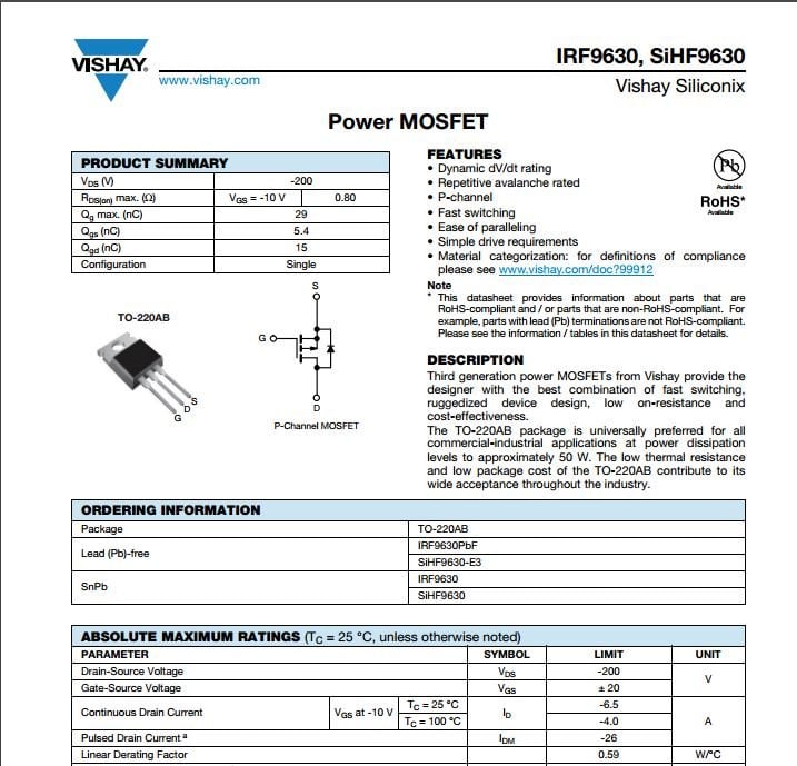 IRF9630 - IRF9620PBF - IRF 9630 - 4A. 200V P KANAL MOSFET