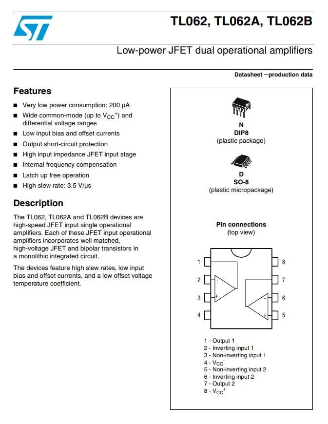 TL062CN - TL062 - Low-power JFET dual operational amplifiers